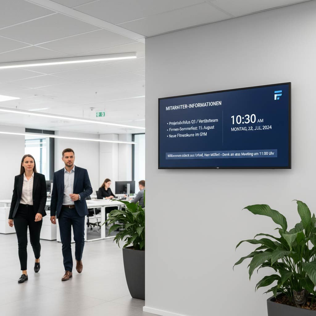 Mit Digital Signage zur Mitarbeiterinformation sorgen Sie für direkte Kommunikation am Arbeitsplatz. Aktuelle Inhalte, Termine und Hinweise werden in Echtzeit angezeigt.